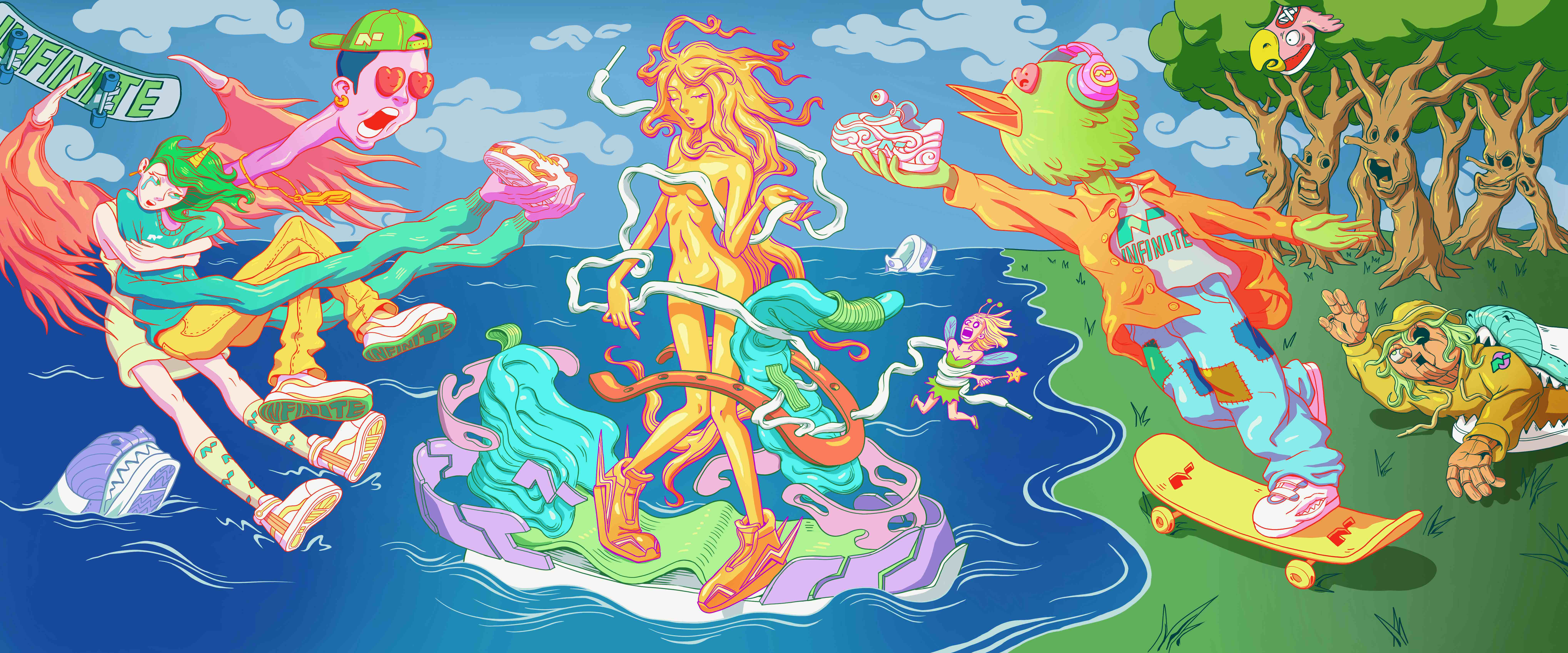「追求潮流這件事情對有些人來說是個重心,甚至可能像宗教。他們願意花上很多時間及資源去得到感動自己靈魂的東西,這對我來說是很酷的生活態度,所以這幅色彩繽紛的畫獻給每一位潮流追求者。」