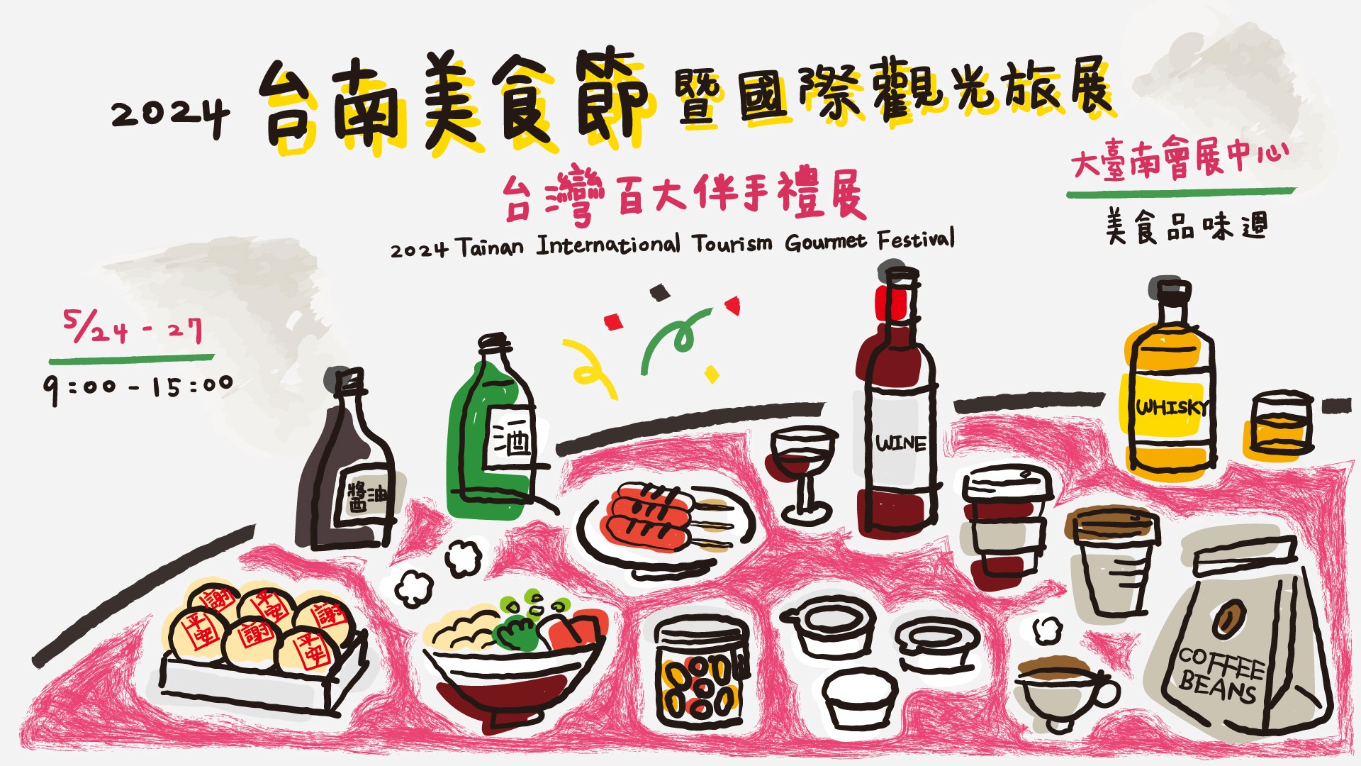 「食料品制作所」參與本次 2024 台南國際觀光旅展暨美食節《台灣百大伴手禮展》的主視覺設計。以其活潑童趣的筆觸和鮮艷明亮的色塊,生動地描繪了生活中的各種食品、飲料、甜點。作品呈現一種自然童趣的風格,彷彿散發著食物誘人的香氣,讓人置身於美食的世界中。