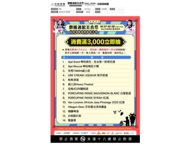2023 微醺酒館美食祭與妖怪酒館萬聖變裝之夜是一場集結節慶、生活、時尚與潮流的綜合性活動,於台北松山文創園區5號倉庫舉行。活動特色包括討糖活動、萬聖變裝遊行、恐怖箱體驗、百鬼動滋舞會及微醺派對,旨在為參與者提供豐富的萬聖節體驗與獨特的節慶氛圍。