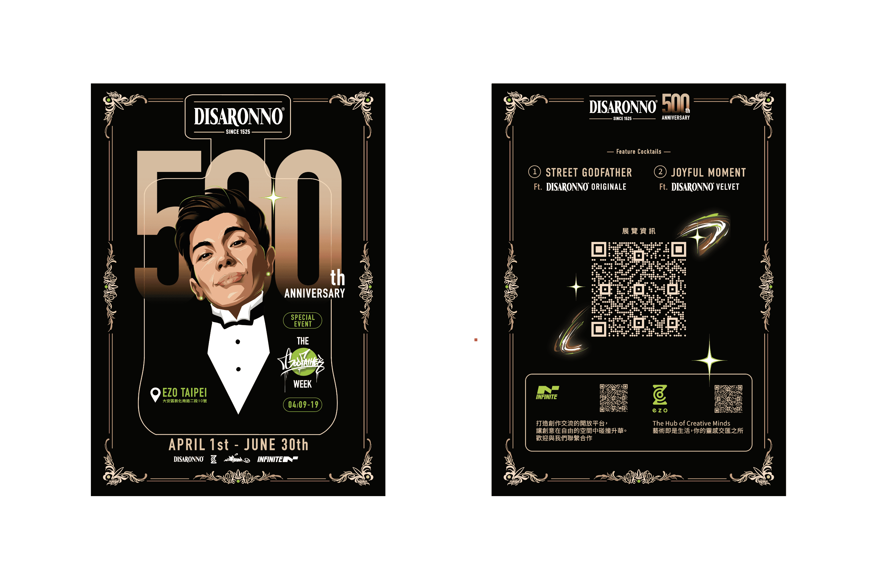 為慶祝經典杏仁酒品牌 DISARONNO 邁入 500 週年,EZO 攜手 INFINITE 噴漆藝術家 Allo 與主理人 Jason 展開跨界共創,將畫作元素融入調酒,打造視覺與味蕾交織的感官體驗,為傳奇品牌注入當代創意。