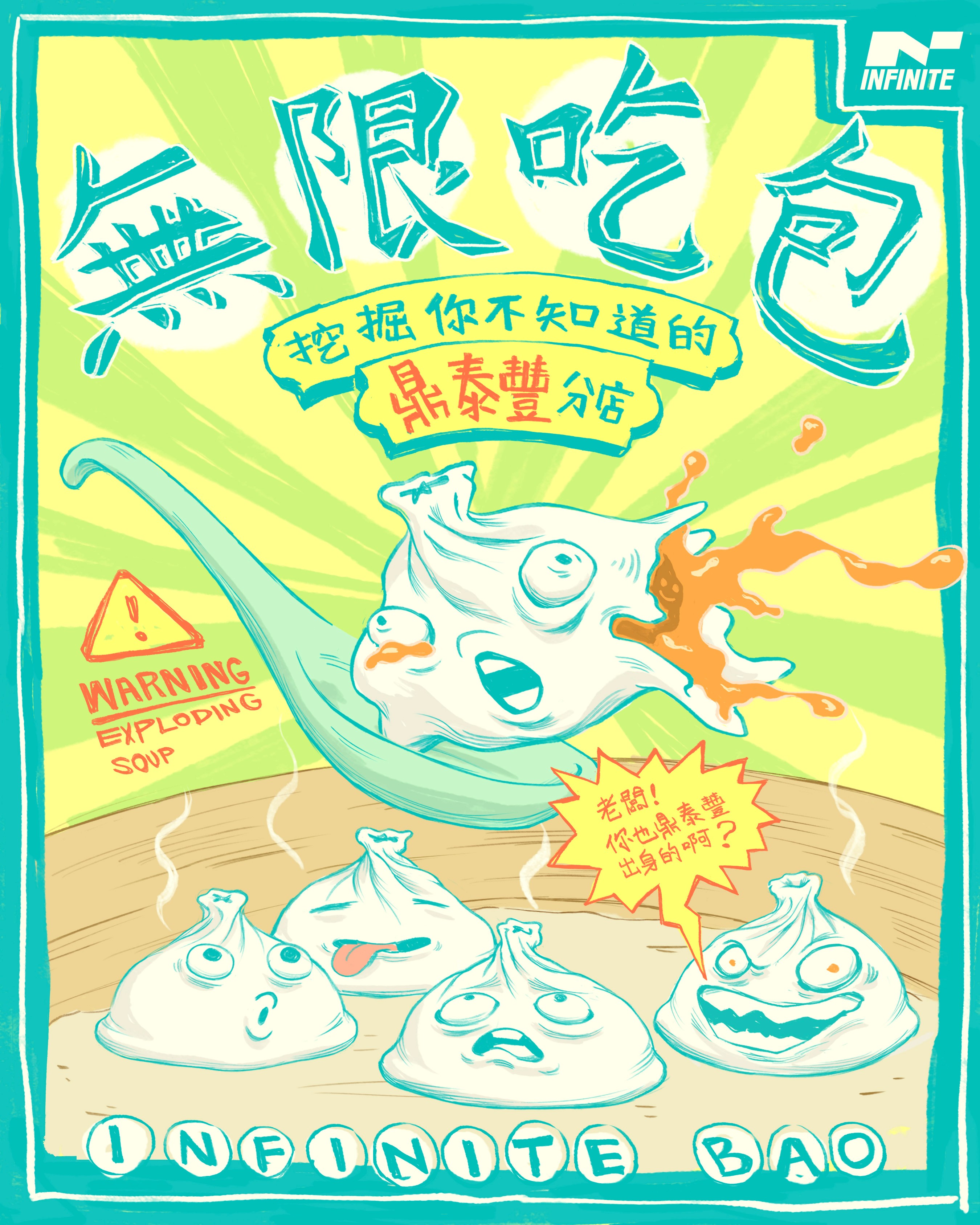 本次設計以INFINITE品牌色為主視覺,搭配充滿趣味的插畫風格,打造一系列具個性的小籠包角色,象徵遍布台灣巷弄的隱藏名店。透過角色設定與活潑畫面,呈現KOL帶領觀眾尋訪「前鼎泰豐師傅」的探索精神,讓整體視覺充滿美食的樂趣與發現的驚喜。