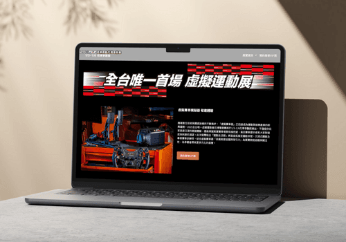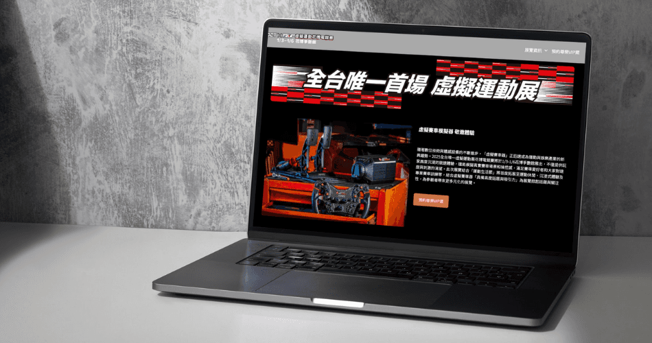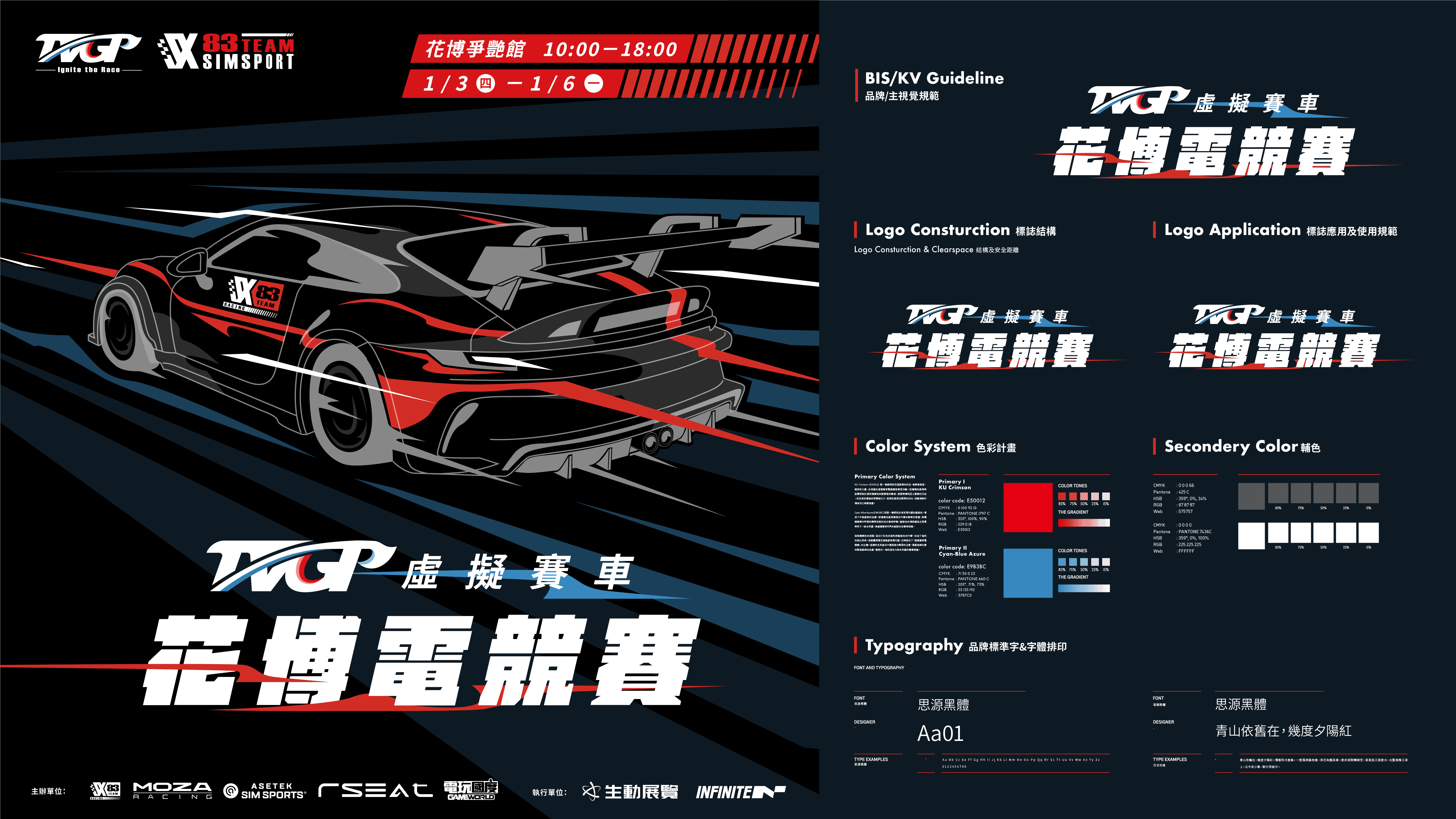 本次設計以黑色為背景基底,搭配藍、紅、白光線交錯流動,營造出具速度感與未來感的虛擬賽車世界。透過光影層次打造強烈景深,呼應虛擬賽車器所帶來的沉浸式體驗與極速張力,強化展覽的科技氛圍與競速魅力,吸引觀眾瞬間進入一場視覺與感官並進的虛擬運動盛會。