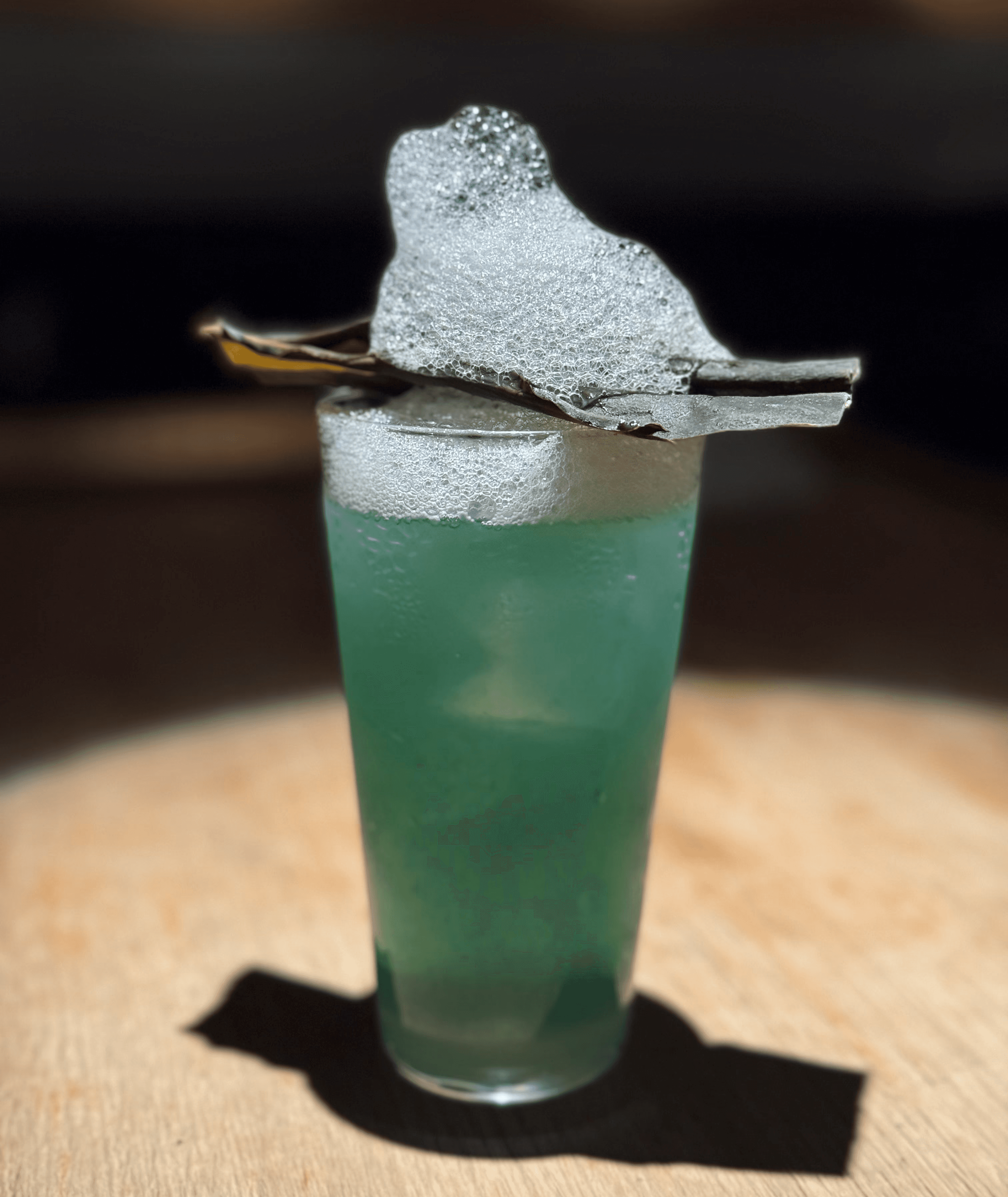 調酒〈蒼潮之間〉以煙燻龍舌蘭與泥煤威士忌為基底,揉合椰糖、昆布通寧與旨味泡泡。海的鹹香與風的層次交錯,如信念漂流於浪間,自由而孤獨。