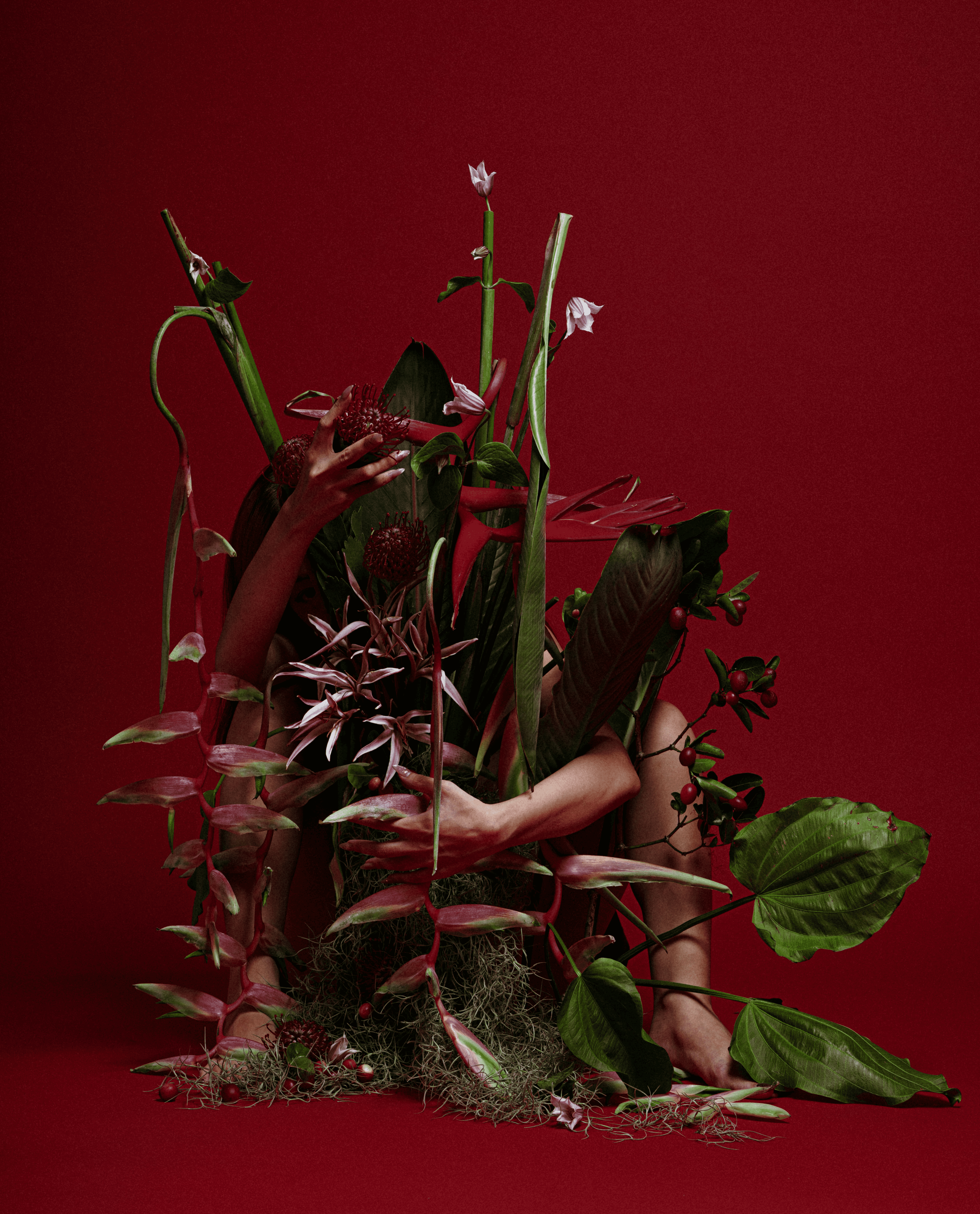 人物被紅色花與熱帶植物覆滿全身,象徵慈悲與生命力。身體與自然合一,在熱烈與混亂中抵達寧靜。那是「我即萬物」的覺醒瞬間。