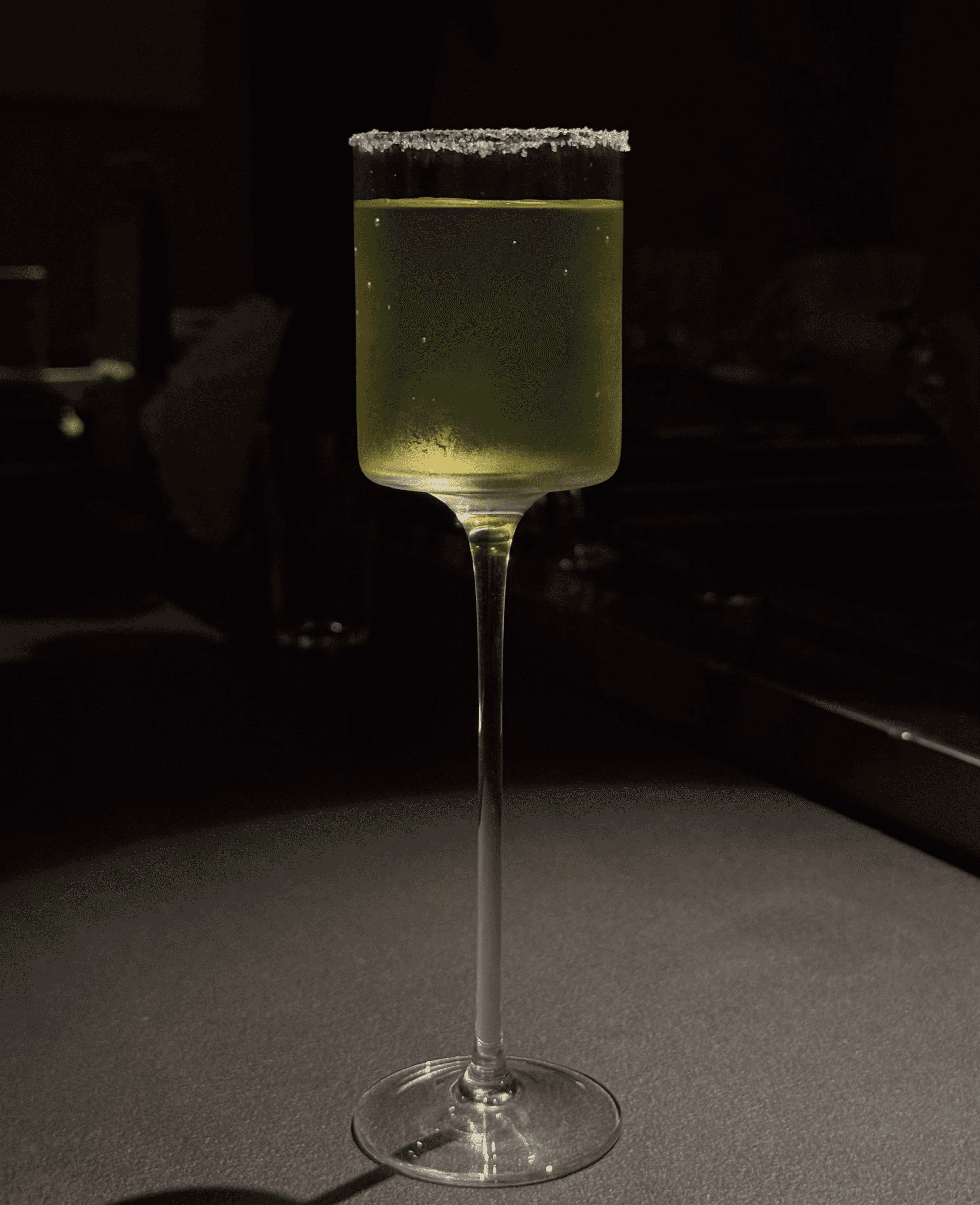 調酒〈照見〉以琴酒、龍膽草酒、艾草酒、紫蘇和海鹽組成,靈感來自經典雞尾酒「寶石」,比擬珍珠;杯緣上的海鹽,象徵著眼淚。