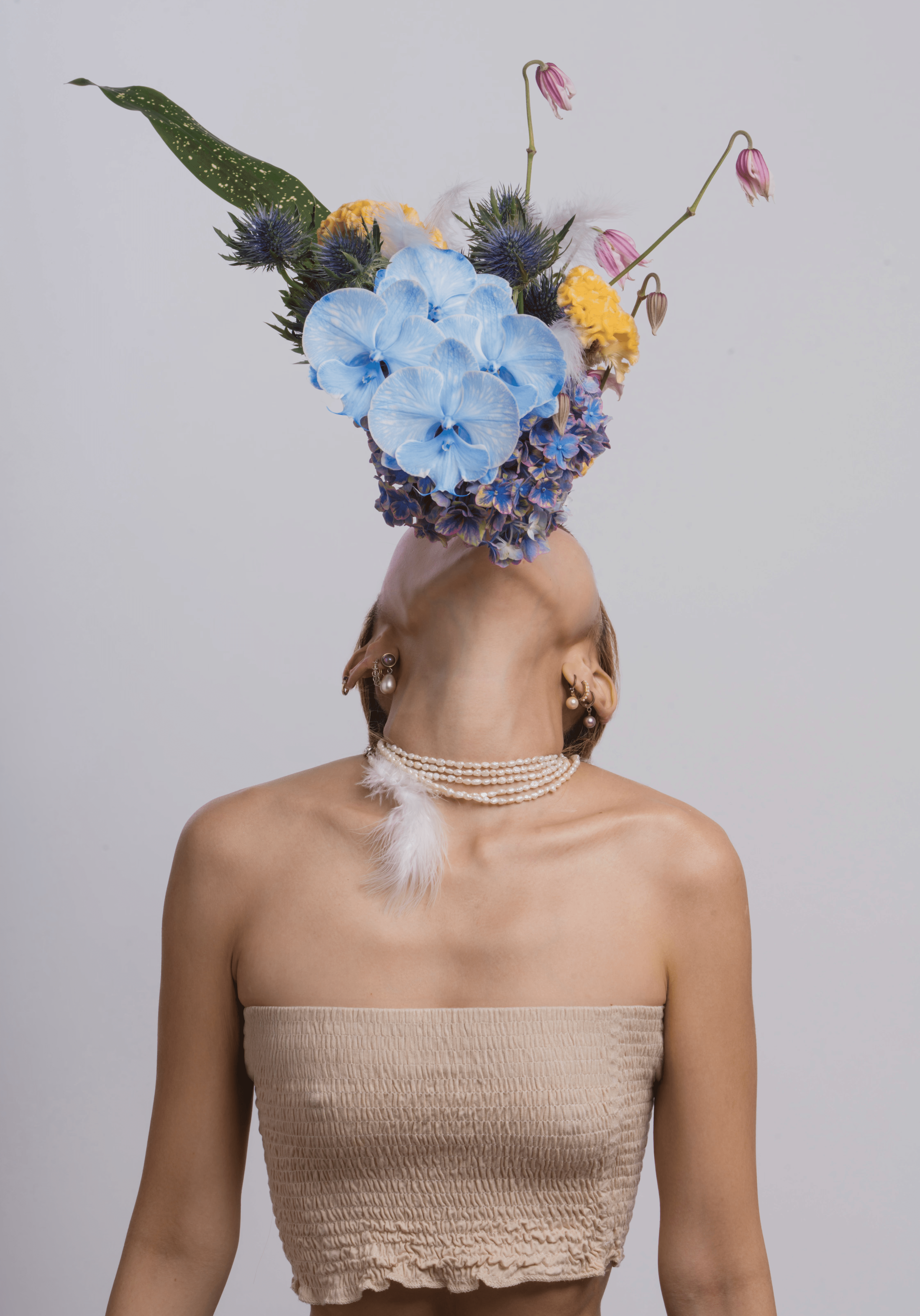 裸露的軀體以雙手擁抱自身,指間開花,覆有灰塵與泥。花從傷口綻放,象徵脆弱與成長並存。藍,是深海的顏色,也是情感最柔軟的呼吸。