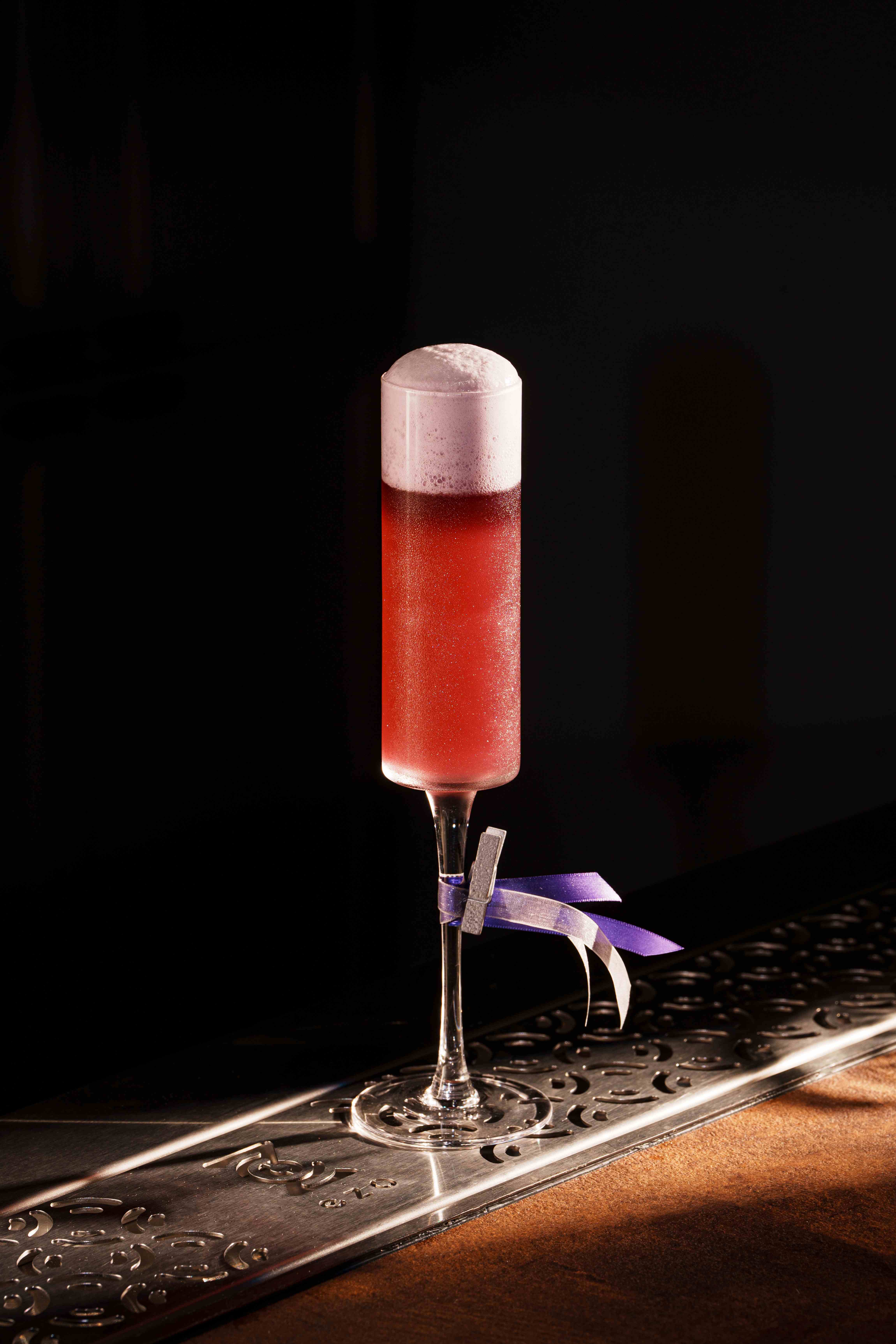 自製薰衣草琴酒為基底,藍莓與接骨木果香交錯,白葡萄酒帶來輕盈感。紫色漸層象徵他的多重面貌,晶粉流動如表演時的優雅舞蹈,薰衣草的沉穩氣息貫穿其中,溫柔優雅卻深藏故事。